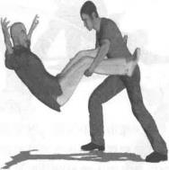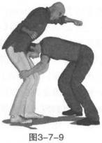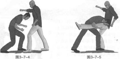 头部来势凶猛我可以迅速闪身重心下沉避开对手拳锋(图3-7-4)紧接着我左手前伸快速插入对手裆部顺手抱住其左臀部右手由对手左腿外侧牢牢抱住其大腿两手协同用力向上抱提同时用左肩向前顶撞对手左胯部及大腿根部令其重心不稳向后仰摔(图3-7-5)