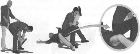 动作说明实战中我趁对手不备身体突然前俯双腿屈膝下蹲双手随势向下搂抱住对手双腿膝窝部位同时重心前移用头部向前猛顶其腹部令其重心失去平衡上体后仰(图3-7-9)随即我双手用力向回提拉将恐怖分子双腿悬空提起配合头部前顶上下交错用力瞬间将其仰面摔倒在地(图3-7-10)。上动不停我身体迅速左转左手臂用力翻拧对手右小腿右手臂同时翻折其左小腿使其在仰摔着地的瞬间将身体翻转过来变成脸面朝下、趴俯在地姿势我身体随之继续左后转右脚抬起由其身体上方跨过双腿屈膝下蹲重心下沉以臀部为力点向后猛坐对手后腰双臂配合用力夹住其双腿上体后仰搬折其双腿的同时形成针对对手髅关节的锁控(图3-7-11)。