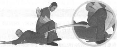 合双手动作向前顶撞。对手仰面摔倒时我双臂要使劲用腋下夹住对手的小腿部位。臀部后坐要找准位置是恐怖分子的腰部而不是其臀部目的是将其腰椎坐折彻底丧失行动能力。