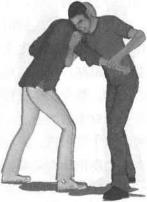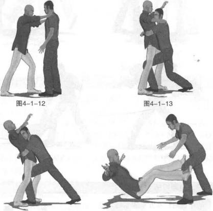 动作说明双方不期而遇正面交锋(图4-1-11),对手突然伸出双手扑抓过来欲抓住我双肩进行撕扭(图4-1-12)我迅速降低身体重心左脚快速向前上步、插入对手两脚之间双手由对手两臂内侧插入并环抱其腰部右手抓住左手腕部紧紧扼住头向左转将脸贴在对手胸前(图4-1-13)继而双臂用力勒锁对手腰部身体重心向前移动