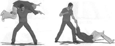 跟部位(图4-1-8)左手用力提拉,部为力点向上扛其对手(图4-1-9)手摔倒在地(图4-1-10)