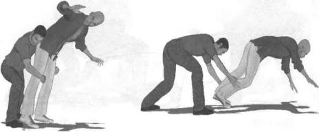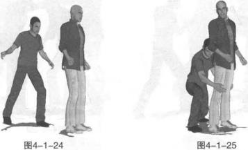动作说明实战中我在敌人背后悄悄跟踪伺机而动(图4-1-24)时机成熟时突然俯身下蹲双手自后向前快速搂抱住对手两腿膝盖处并用力提拉同时用头顶撞其后腰或者臀部使其重心不稳身体失去平衡向前扑摔在地(图4-1-25图4-1-26图4-1-27)。技术要领抱膝时后腿要用力蹬地上体前送。图4-1-26 图4-1-27