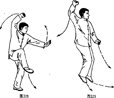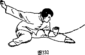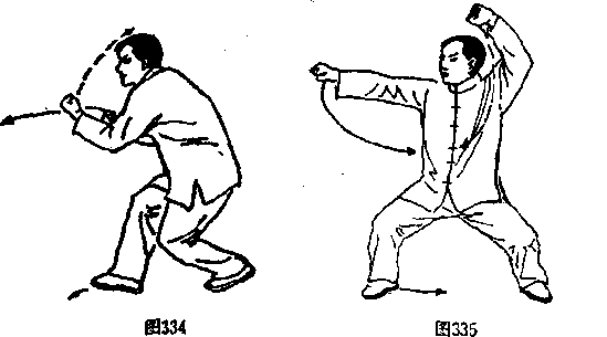 图332摆至体后,两手臂仍成斜平 拳。目视右手方向。(图333)脚为轴,右转体。右 手向上,随转身向右 劈左手经体侧由下右腿蹬直,重心 左移成左弓步。同 时,左手沿左腿穿出 并挑起,两手臂成斜 平拳。目视左手方 向。(331)右手向前 省拉出,左手向上摆至 身后。(图332)以两