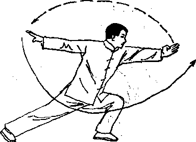 身体落下,右脚 先落地,左脚向前落 地,成彳卜步。右手向 后伸直;左手摆落于 左肩前。目视左方。