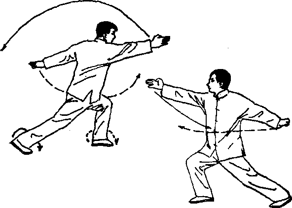 要点:跃步要高,落地要轻。两手挑击绕转要直,以腰 带臂。完成马歩之前要含胸收腹,为冲拳蓄好力量。