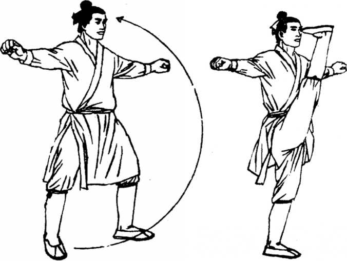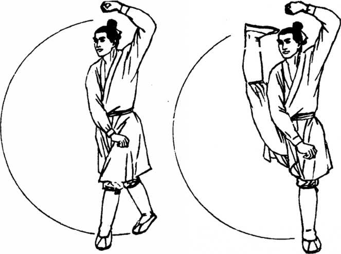 踢脚必须勾脚尖,快速直向前额处。 直膝收就启动时,术语称作正踢腿。