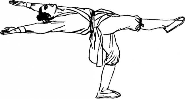燕抄水式单脚立,且把一腿后抬起。