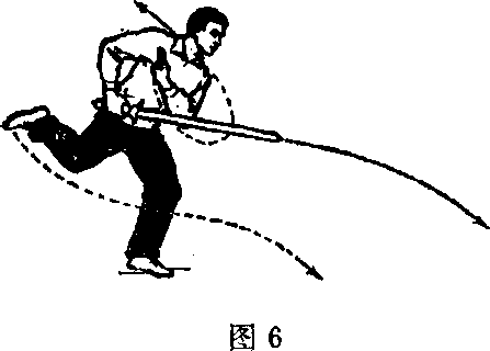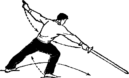 ① 上身左转九十度。 左脚向前跨步落下,稍屈 膝;右腿屈膝,右脚后抬 (脚心斜向上)。同时, 右手持剑,随体转下落至 右髓外侧,剑尖向前夕左 手剑指屈肘向下、向右上悬臂于胸前。目视前方(图6 )。② 图7图7图8图8上动不停。右脚随即向前跨步,成右弓步。同时,右 手持剑向前直刺3左手剑指顺跨步之势,向下、向后直臂斜 上举(手心向下)。目视剑尖(图7)。图7图7图8图8