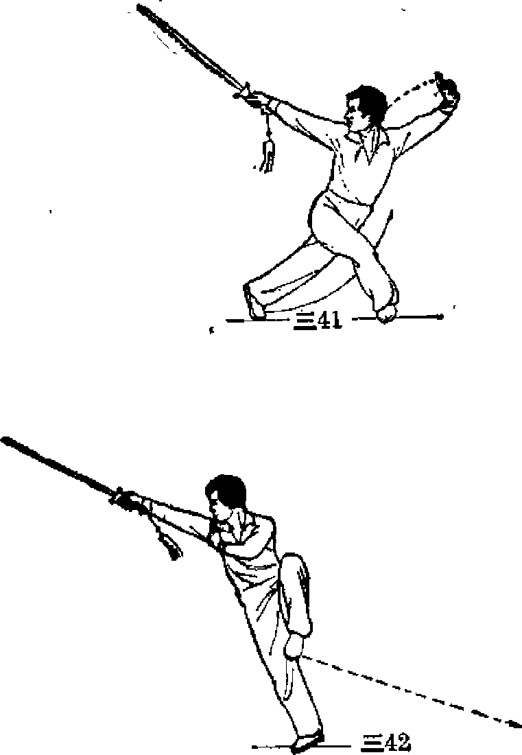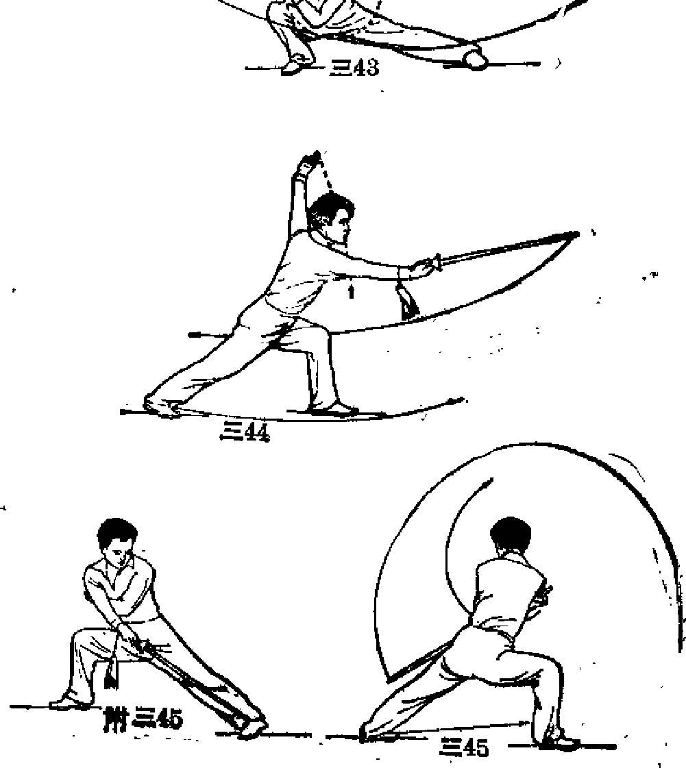 1)右幅直立才左脚屈膝提都左手剑指落于右肩内黜身您聊周三42八(2)右腮全蹲左腿向体空方落步伸直成左仆步,然后重心前移左腿屈膝成左弓步手同时右手握剑由后向下经体右硼向前撩出手心朝上、力达剑刃前上端,左手剑指向下向左、向上划一大弧抖腕上架于左上方目视剑端(图三4344)