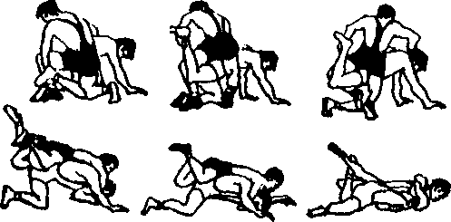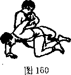 开始姿势:一赫撑,一方从侧面把腱。进攻者左臂压颈, 右腿从对手腹下裆里向后伸勾住对手右大腿,左腿从后侧和右 腿交叉在一块,放手左臂,右臂从对手背上伸过去,从里侧去拉 对手左臂,右手帮助,把对手左臂放在颈后,右臂向后抱住对手 左臂上部,用头枕压撬双手,使对手躯干向右后侧翻转输分,(图 160) o接着放开缠腿的双腿向左转体成俯卧压桥。
