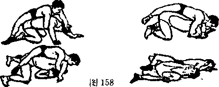 蹬左腿向左侧倒之力,使对手躯干向左后翻转,接着向左转体成 俯卧,右臂向对手颈后伸,右腿从上边压住对手右大腿。同时可 变成左臂抱压住对手右臂,右臂抱胸成压桥型,(图158)。