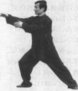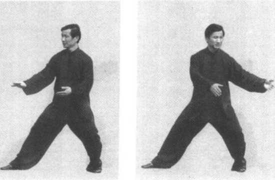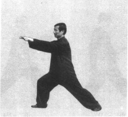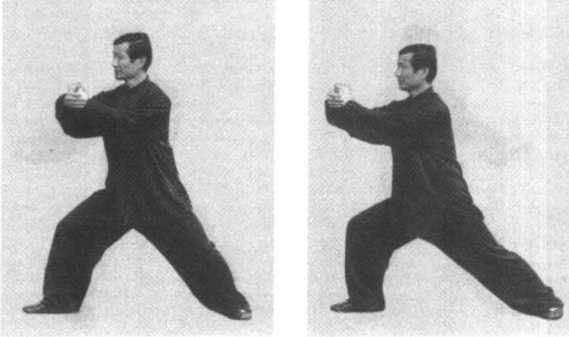 身体向右转腰,重心 前移成右弓步;左手屈臂 掌心向前搭近右腕内侧, 右掌心向内,双手同时向 前挤出,两臂保持半圆形 (图二 - 228、图二-229)。