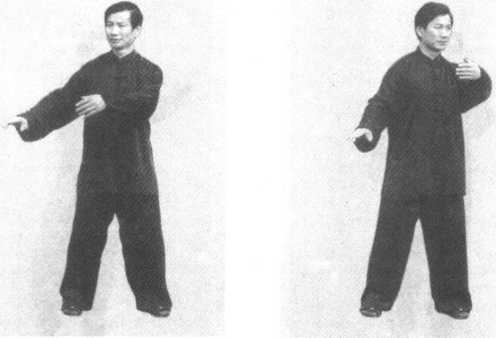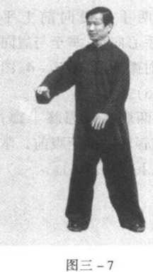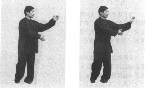 身体略右转,然后重 心慢慢左移,右脚跟提起; 左手经腹前先向右云至胸 前,上体左转,再经面前向 左云,掌心向内(图三- 7~图三-9)。右脚向左脚并步,重 心右移,左脚跟提起;右掌 经腹前,先向左云至左胸 前,上体右转,再经面前向图三-8 图三-9右云,掌心向内(图三- 10?图三- 13)。图三-12图三-13