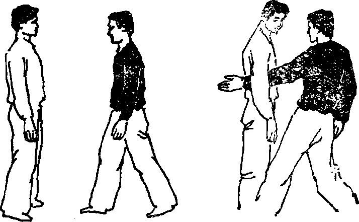 乙顺前势右转身左腿后撤半步上体抢在甲肩之上。如图77。