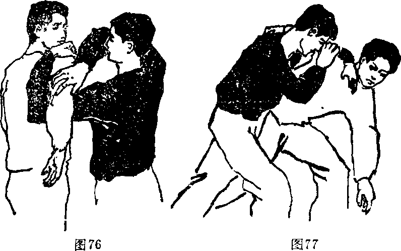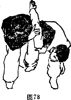 乙顺前势依靠左臂向下向前翻转下压甲的右臂。甲在右臂剧疼又挣脱不开情况下必然受制于人。如图78。