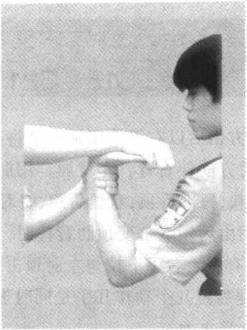 图312图312腕拿变扛拿图313-317)腕拿变扛拿图313-317)动作当我用左掌击打对方头部时对方双手按住我左掌用力回折欲用折腕拿将我拿住我迅速用左手前顶右手抠住对方右手腕关节旋拧上翻同时右后转身用左肩紧紧顶住对方左腋下用力上顶两手继续用力旋拧对方右臂并向下拉,将对方拿住。