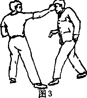 动作由左格斗势起右脚向右侧移动约15公分。同时右拳借向左拧腰、蹬腿之力向左前方屈臂划弧横击拳心向下高与鼻平力达拳面左拳随之收回左肩前。拳心向右目视右拳(图3)。左摆拳动作相反。