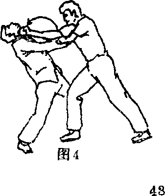动作由左格斗势起右脚上前一步右拳由内向上经面反臂向前向下挂击高与鼻平力达拳背(图4左挂拳动作相反。