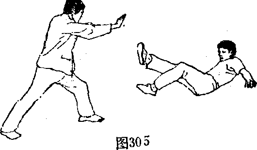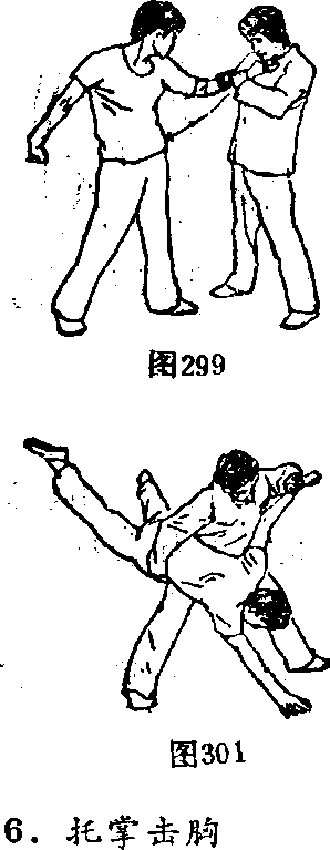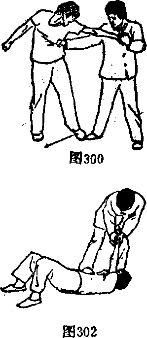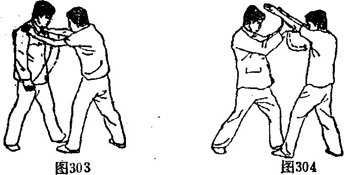 动作(1)对方伸双手搭我左右两肩(图303)(2)我猛向上托其两臂(图304)。