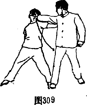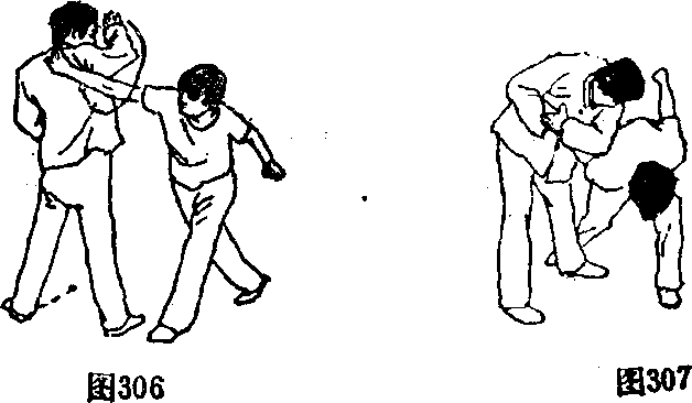 (2)上动不停右臂向外环绕夹对方右臂于腋下同时左小臂向下横压其肘关节将对方擒拿(图307)0