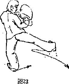 接上式右脚着地左腿向前迈一步随即右腿略屈脚跟擦地向左钩绊,脚尖上勾成钩镰腿右腿不停随摆劲屈膝提起向前踹击随即上身右转即而再向左拧3两拳变刁勾右手由胸前向上、向右下置腹前勾心朝下左手由胸前向下、向左、向上置于胸前勾心朝下两勾尖相对手同时右脚向前跨出两腿屈膝成右麒麟步右手向上左手向下(两手上下倒换并向外扭转九目视前方(图23、24)