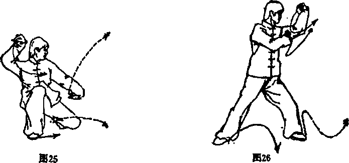 技击要领对方若用右拳击来我以右手刁抓对方的手腕并向右后拉带顺势用左刁勾撩击对方裆部若对方向前弓身我即挺身以左手向对方的面部螺旋穿击使对方上下受击。