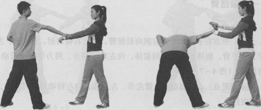 2 过程甲方右手拿住乙方右腕向后扭臂。乙方右臂屈肘撤左步左手抓按住甲方右手背躯体贴紧甲方的躯体向左转成马步用力学的转动原理将甲方摔倒。(图4-7、图4-8)