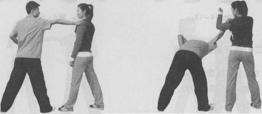2 过程甲方右手抓握住乙方的左腕手心向下拇指向内。乙方上左步,右手扣按甲方的右手手背左手向右旋转右手向前推折甲方右手腕。这个动作是运用了力学的转动与杠杆原理完成的。(图4-9、图4-10)