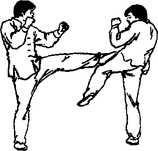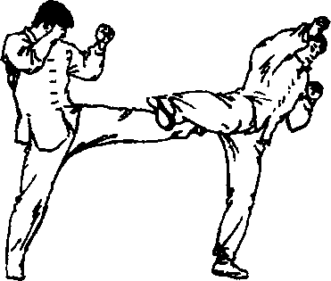 当对方使用侧弹腿进攻时,用蹬腿阻击其大腿或腹部(图8-1308—131)。例8:蹬腿破侧踹腿。当对方提膝用侧踹腿进攻时,抢先以蹬腿封堵,攻其腿部(图 8—132)。例9:对方用转身后摆腿进攻,当其背对转体时,用蹬腿击其背部或臀部(图8 — 133)。