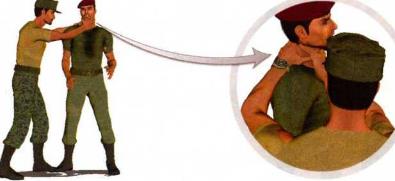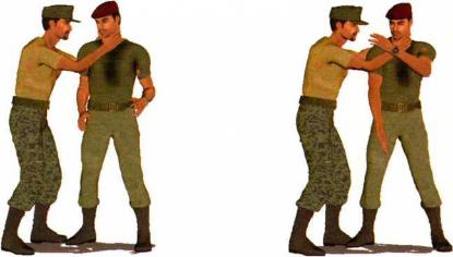 (1)敌人由我身体右侧逼近突然伸出双手、张开虎口卡掐住我的脖颈,其左手卡住我后脖颈右手掐住咽喉部位双手一并发力(图1-3-11)。