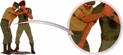 以色列国防军格斗技术全解以色列国防军格斗技术全解图1-3-9图1-3-9(4)继而右脚向右逼近一步身体重心向右快速移动在左手牢牢控制住对方右手的同时右臂屈肘以肘尖为力点随身体右移猛击对方下颌或者面颊,迫使其彻底放弃对我脖颈的控制(图1—3-10)。