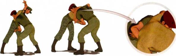 其会不由自主地向后退缩臀部而导致上体前俯。此刻我可以迅速将右臂高高抬起伸展至对方脖颈上方(图2-3-10)。
