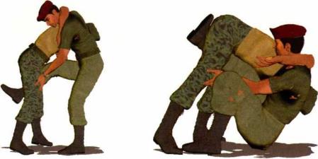 (4)动作不停右腿向前抬起右脚由对方两腿间穿过左手托住其右侧大腿位置(图2-3-18)。