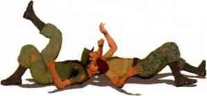 2-3-182-3-18图2-3-19 图2-3-20图2-3-19 图2-3-20(6)上体后仰后背着地右臂夹紧对方脖颈右侧肩胛用力向后压制。同时右腿借助身体向后跌坐的惯性猛然向上方扬起勾挂对方腹股沟。瞬间动作可令敌人身体重心失衡被迫向前翻滚由我身体上方摔至我头顶上方(图2-3-