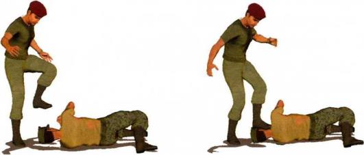 (7)成功将敌人摔出后我迅速向右翻滚、起身并进一步用左脚踩踏其头部(图2-3-22至图2-3-24)。
