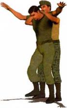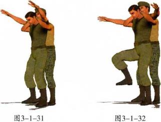 (2)此时我迅速将双臂向上抬起同时右腿屈膝向上提起右脚脚尖上勾然后骤然垂直下落以脚后跟为力点狠狠踩跺敌人右脚脚背(图3-1-32、图3-1-33)。