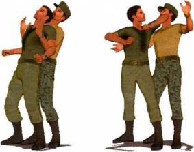 ★身体后仰时脖颈一定要用力挺直与双臂下压动作配合协调以针对敌人双手形成压力。随后的转身肘击动作要充分利用身体拧转来发力攻击。