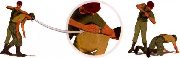 (1)敌人由正面向我发动攻击突然快步前冲伸出双手、张开虎口卡住我的脖颈并用力推操对我形成威胁(图1-1-33)。