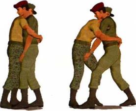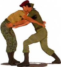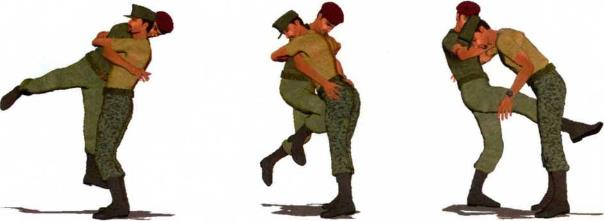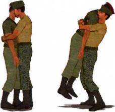 (1)敌人由正面对我发动袭击突然伸出双手将我连同双臂一并环抱住并用力向上提抱欲将我举起(图4-1-30、图4-1-31)