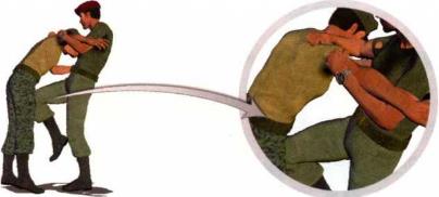 (3)旋即双手揽抱对方腰做右腿屈膝以膝盖为力点使劲向前冲顶敌人裆腹部瞬间可令其放松对我的搂抱(图4-1-33)。