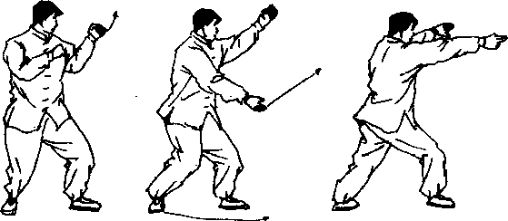 攻防意识:练习时吱想敌右拳向我面部打来;我左掌向左 上挑开敌右拳,动作不停,右脚前上一步,并用右手-指戳击 敌喉部’