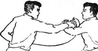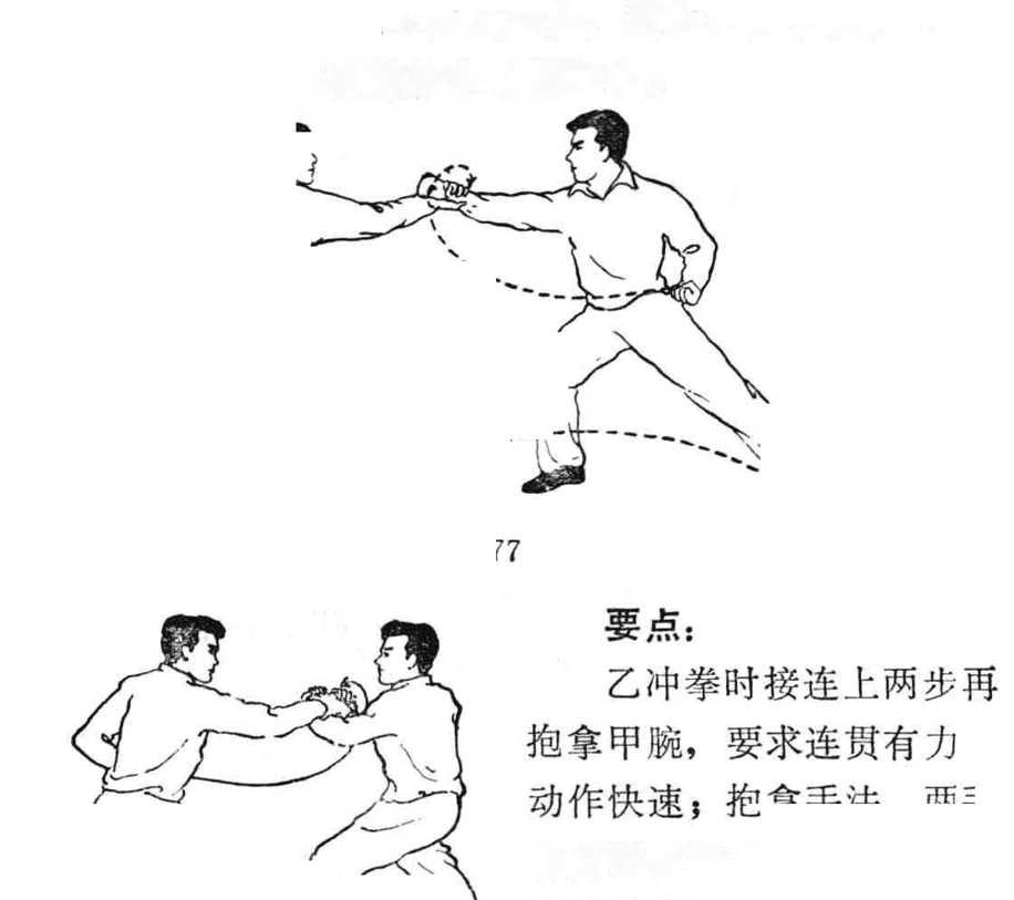 1 接上势乙上右弓步用右拳击甲胸3甲上右弓步刁搂乙右腕(图77),2 接上势乙再上左步成马步用左手由甲右腕下插入双手合力抱住甲右腕拧拿(图78)。 合力以右手指扣卷里拧使 对方失去控制能力。―—工,4易犯错误图78 合抱无力指未里拧。教法先练上步冲拳再练刁甲手腕再作上步拧卷抱臂练习。
