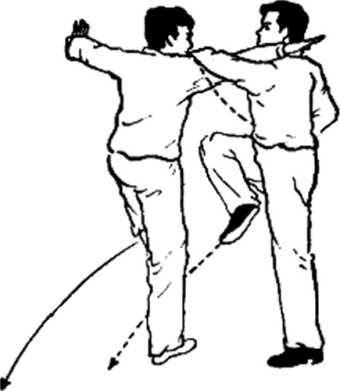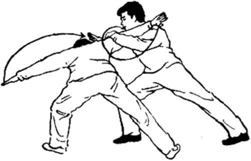 上动不停当甲用右手指戳插乙喉时乙头急向右闪去,避开甲之右掌3同时以左臂扣锁甲之右臂接着用右臂压切甲颈右侧身体前探成右弓步,乙身被切向前倾成左弓步,左手侧伸,甲眼视乙(图27)。