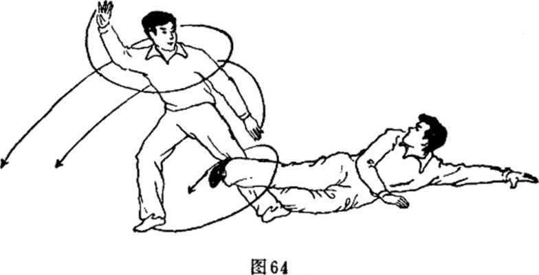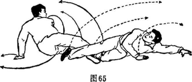 接上动当乙用剪绞腿法把甲绞倒时甲急趁势向右后方扑倒(图65)。