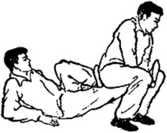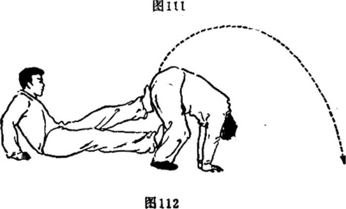 上动不停当甲腿被乙坐压之后甲身后倒左腿屈膝脚蹬乙臀(图111、112)。