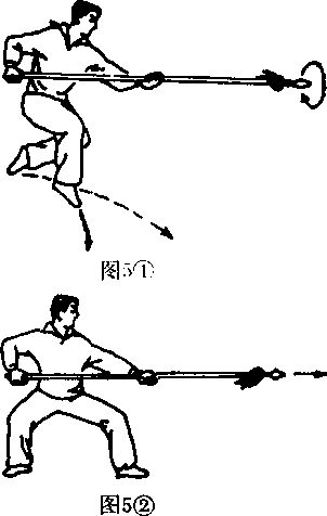 1. 右手向后抽把,左手滑握,身体微右转,做拦枪动 作;同时,右腿屈膝向前摆起,左腿蹬地跳起,身体腾空, 在空中做拿抢动作。(图5①)