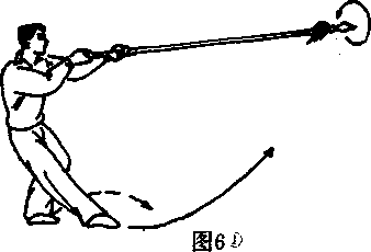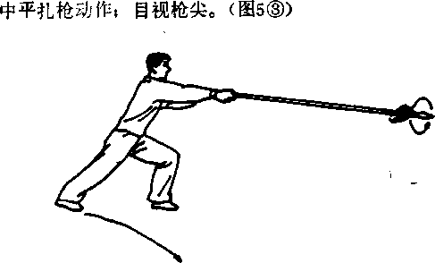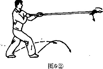 1. 右脚向右前方上一步,身体微右转;同时,左手松 握。右手握枪把端,以左手为轴,右手腕用力使枪尖向左、 向下、向右、向上绕圆。(图6①5