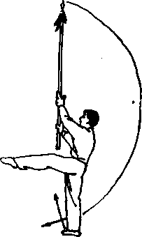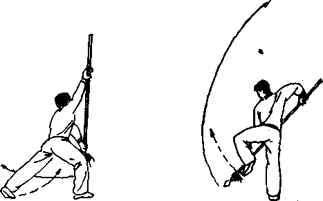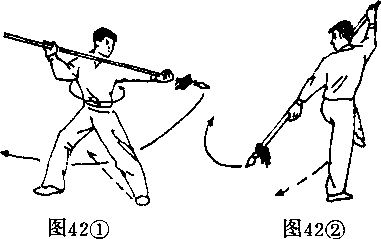 2, 左腿屈膝上提,以右脚为轴;身体向左转180°;同 时,右手向右上提枪把,左手向下、向左摆动,使枪尖向 下、向左划弧,右手握于枪的把端并右上举,左臂向左下方 伸直;目视枪尖。(图42?)
