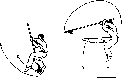 8. 在空中,右腿挺膝向前弹踢,右脚背绷直,左腿自 然屈膝,同时,两手顺势上提,使枪尖沿右腿外侧向前上 桃,两手交叉于头部前上方;目视枪尖。(图41⑧)