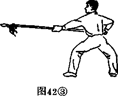 3. 上动不停,上体微左转,左脚顺势前落一步,重心 略前移,两腿屈膝,同时做拿枪动作,(图42③)